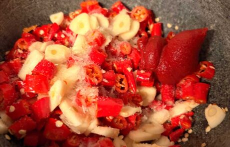 Chili klein schneiden, insgesamt etwa die Hälfte der Kerne aus optischen Gründen entfernen.