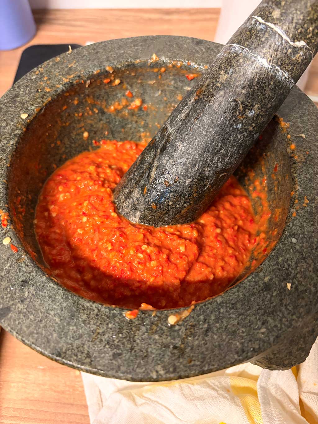 Alles im Mörser mahlen bis es sämig ist (dauert lange).